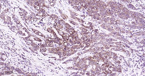 Paraformaldehyde-fixed, paraffin embedded Human Breast Cancer; Antigen retrieval by boiling in sodium citrate buffer (pH6.0) for 15 min; Antibody incubation with PBP Monoclonal Antibody, Unconjugated(bsm-61243R) at 1:200 overnight at 4°C, followed by conjugation to the bs-0295G-HRP and DAB (C-0010) staining.