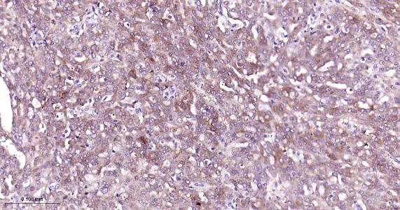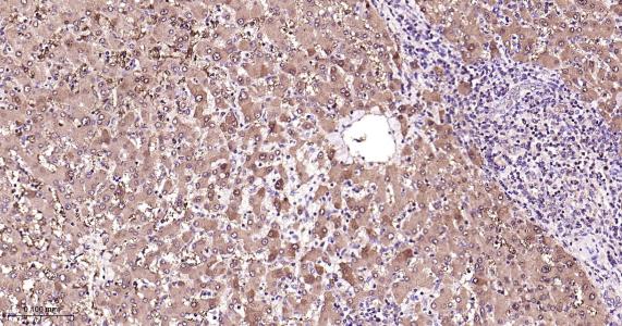 Paraformaldehyde-fixed, paraffin embedded Human Liver; Antigen retrieval by boiling in sodium citrate buffer (pH6.0) for 15 min; Antibody incubation with PBP Monoclonal Antibody, Unconjugated(bsm-61243R) at 1:200 overnight at 4°C, followed by conjugation to the bs-0295G-HRP and DAB (C-0010) staining.