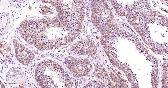 Paraformaldehyde-fixed, paraffin embedded Human Testicles; Antigen retrieval by boiling in sodium citrate buffer (pH6.0) for 15 min; Antibody incubation with PBP Monoclonal Antibody, Unconjugated(bsm-61243R) at 1:200 overnight at 4°C, followed by conjugation to the bs-0295G-HRP and DAB (C-0010) staining.