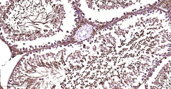 Paraformaldehyde-fixed, paraffin embedded Mouse Testicles; Antigen retrieval by boiling in sodium citrate buffer (pH6.0) for 15 min; Antibody incubation with PBP Monoclonal Antibody, Unconjugated(bsm-61243R) at 1:200 overnight at 4°C, followed by conjugation to the bs-0295G-HRP and DAB (C-0010) staining.