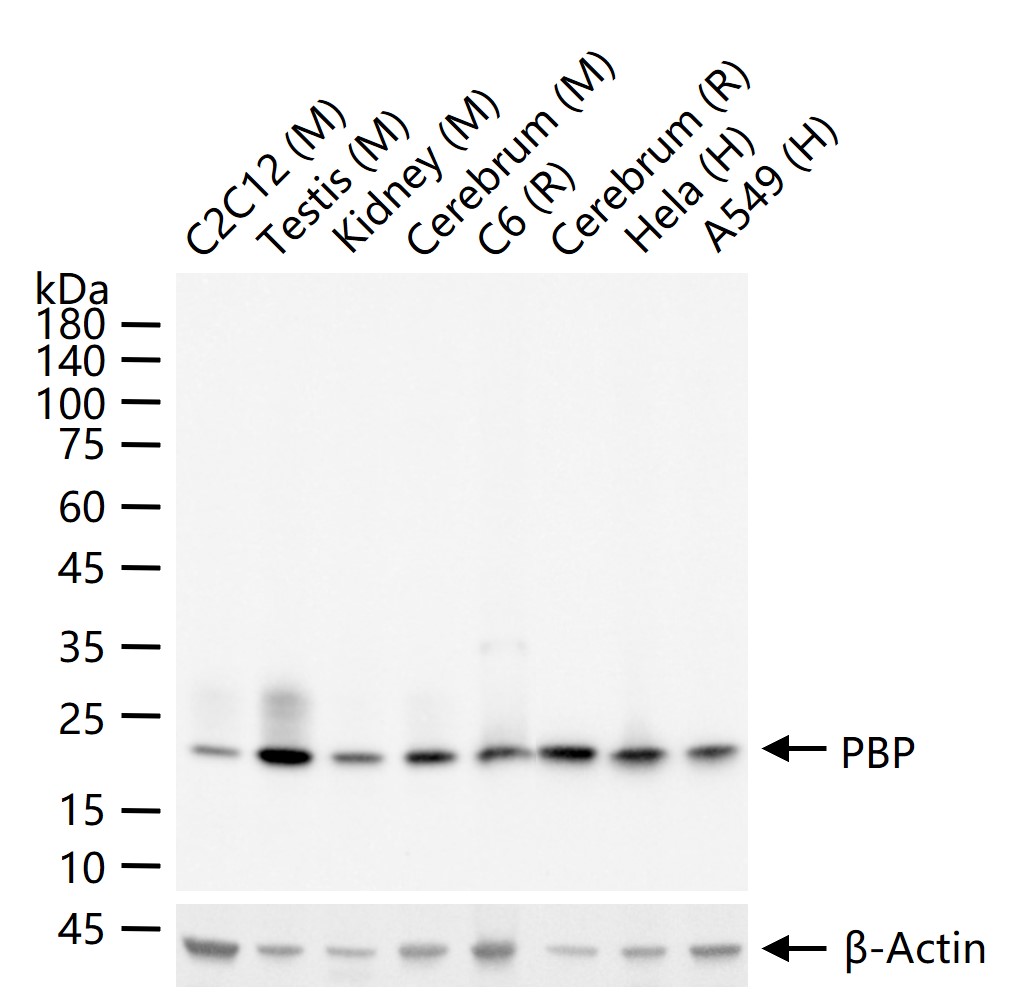25 ug total protein per lane of various lysates (see on figure) probed with PBP monoclonal antibody, unconjugated (bsm-61243R) at 1:1000 dilution and 4°C overnight incubation. Followed by conjugated secondary antibody incubation at r.t. for 60 min.