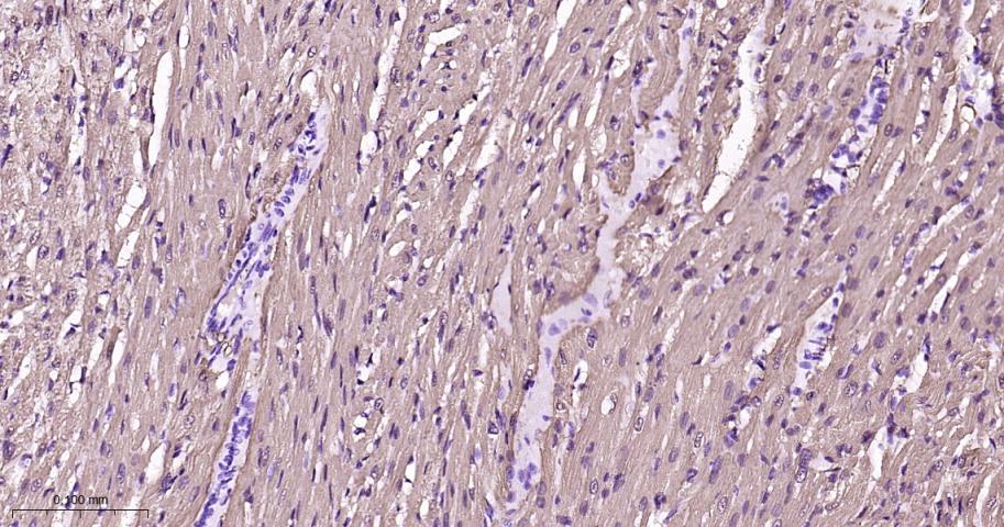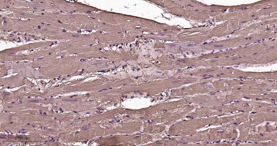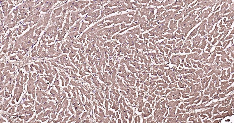 Paraformaldehyde-fixed, paraffin embedded Rat Heart; Antigen retrieval by boiling in sodium citrate buffer (pH6.0) for 15 min; Antibody incubation with Myoglobin Monoclonal Antibody, Unconjugated(bsm-61245R) at 1:200 overnight at 4°C, followed by conjugation to the bs-0295G-HRP and DAB (C-0010) staining.