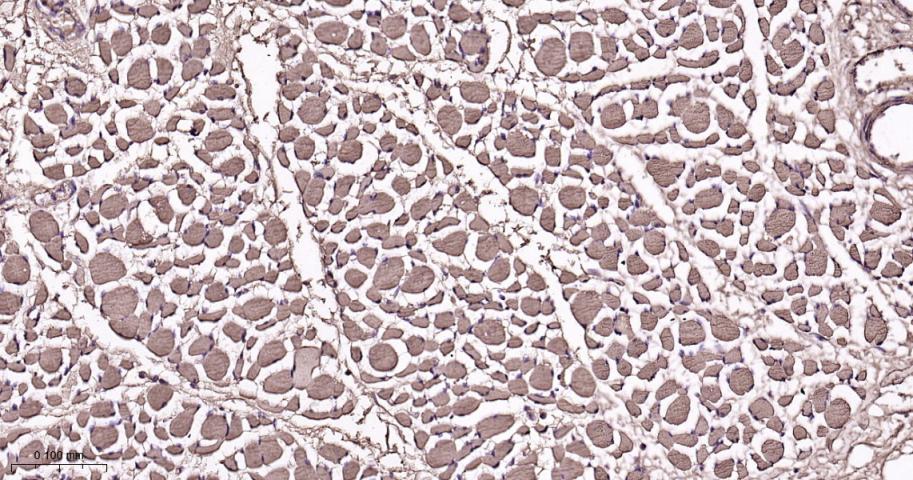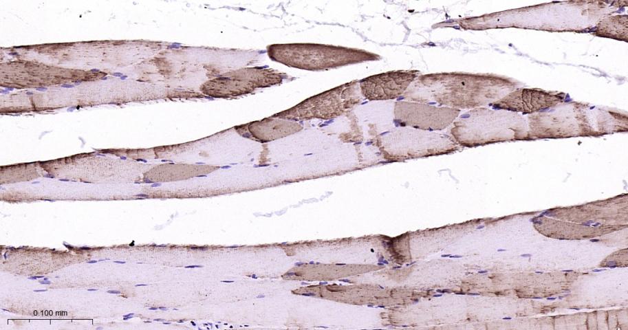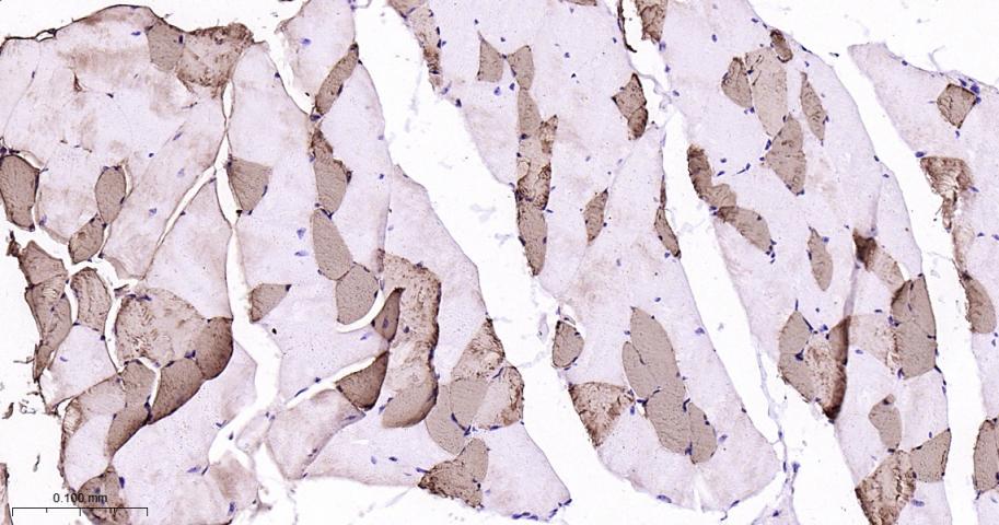 Paraformaldehyde-fixed, paraffin embedded Mouse Skeletal muscle; Antigen retrieval by boiling in sodium citrate buffer (pH6.0) for 15 min; Antibody incubation with Myoglobin Monoclonal Antibody, Unconjugated(bsm-61245R) at 1:200 overnight at 4°C, followed by conjugation to the bs-0295G-HRP and DAB (C-0010) staining.