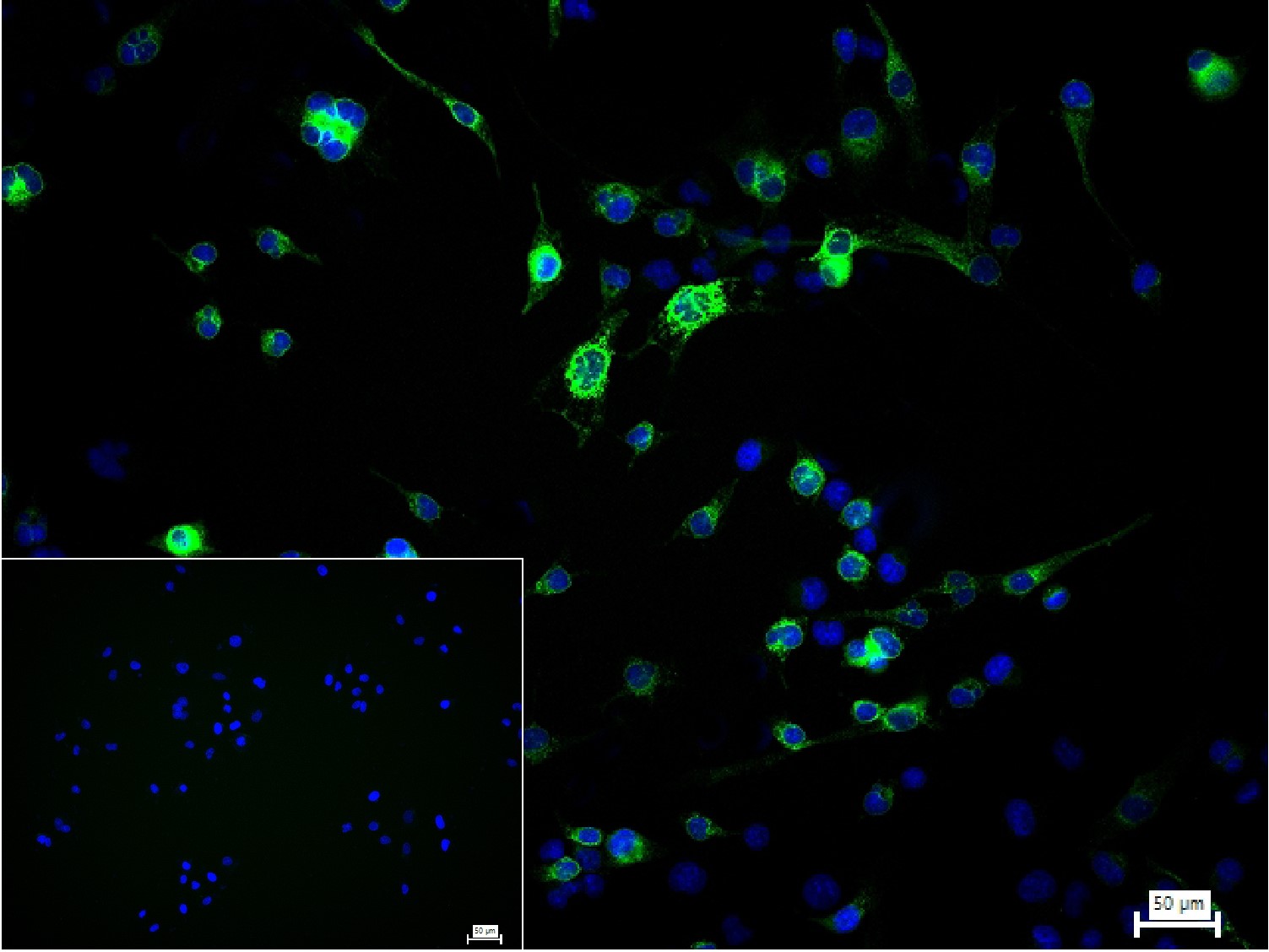 4% Paraformaldehyde-fixed RD (H) cell; Triton X-100 at r.t. for 20 min; Antibody incubation with (SERCA1) monoclonal Antibody, unconjugated (bsm-61247R) 1:100, 90 min at 37°C; followed by conjugated Goat Anti-Rabbit IgG antibody (green, bs-60295G-BF488) at 37°C for 90 min, DAPI (blue, C02-04002) was used to stain the cell nuclei. PBS instead of the primary antibody was used as the blank control.
