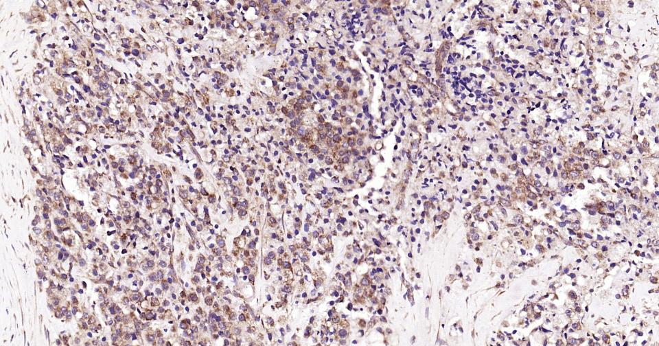 Paraformaldehyde-fixed, paraffin embedded Human Prostate Tumor; Antigen retrieval by boiling in sodium citrate buffer (pH6.0) for 15 min; Antibody incubation with SCF Monoclonal Antibody, Unconjugated(bsm-61250R) at 1:200 overnight at 4°C, followed by conjugation to the SP Kit (Rabbit, SP-0023) and DAB (C-0010) staining.