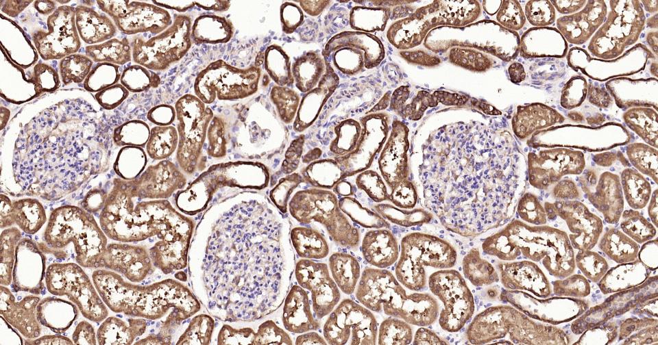 Paraformaldehyde-fixed, paraffin embedded Human Kidney; Antigen retrieval by boiling in sodium citrate buffer (pH6.0) for 15 min; Antibody incubation with SCF Monoclonal Antibody, Unconjugated(bsm-61250R) at 1:200 overnight at 4°C, followed by conjugation to the SP Kit (Rabbit, SP-0023) and DAB (C-0010) staining.