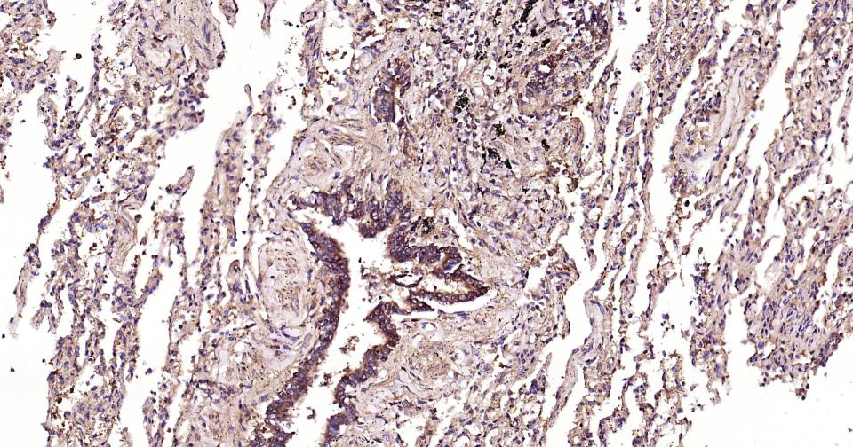 Paraformaldehyde-fixed, paraffin embedded Human Lung; Antigen retrieval by boiling in sodium citrate buffer (pH6.0) for 15 min; Antibody incubation with SCF Monoclonal Antibody, Unconjugated(bsm-61250R) at 1:200 overnight at 4°C, followed by conjugation to the SP Kit (Rabbit, SP-0023) and DAB (C-0010) staining.