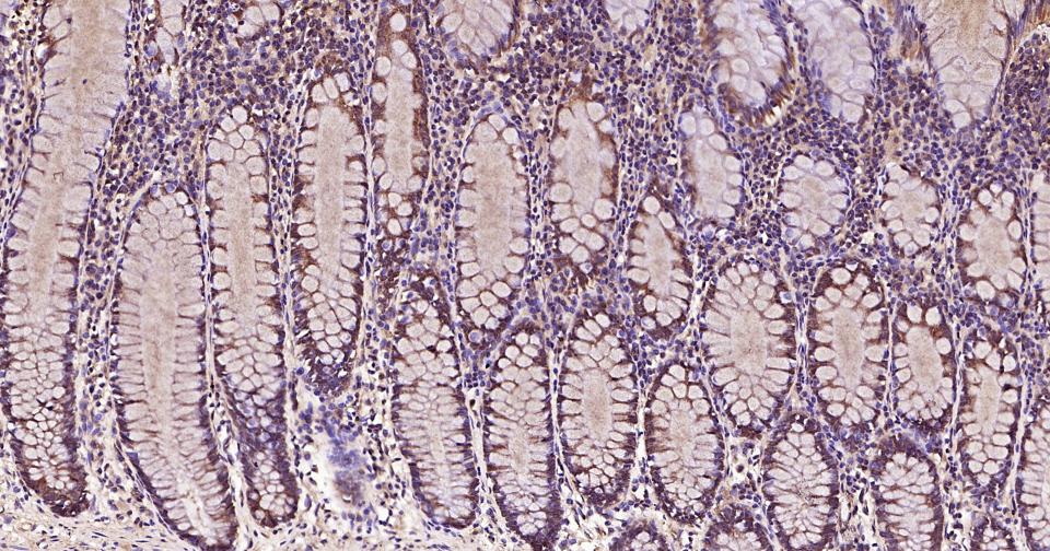 Paraformaldehyde-fixed, paraffin embedded Human Colon; Antigen retrieval by boiling in sodium citrate buffer (pH6.0) for 15 min; Antibody incubation with SCF Monoclonal Antibody, Unconjugated(bsm-61250R) at 1:200 overnight at 4°C, followed by conjugation to the SP Kit (Rabbit, SP-0023) and DAB (C-0010) staining.