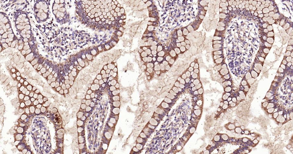 Paraformaldehyde-fixed, paraffin embedded Human Small Intestine; Antigen retrieval by boiling in sodium citrate buffer (pH6.0) for 15 min; Antibody incubation with SCF Monoclonal Antibody, Unconjugated(bsm-61250R) at 1:200 overnight at 4°C, followed by conjugation to the SP Kit (Rabbit, SP-0023) and DAB (C-0010) staining.
