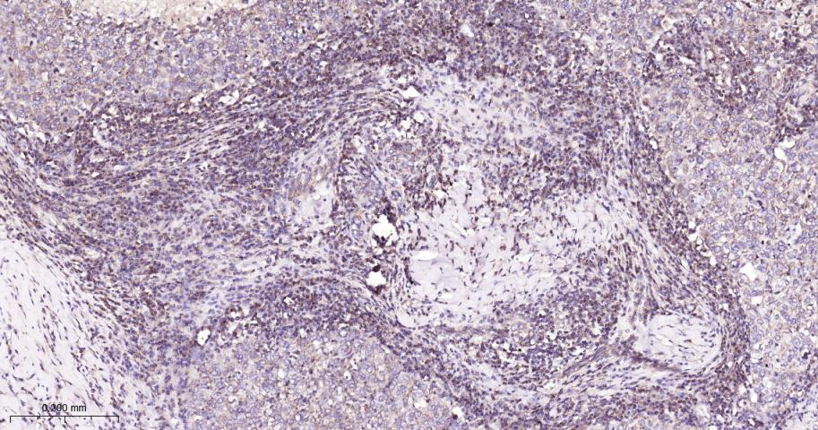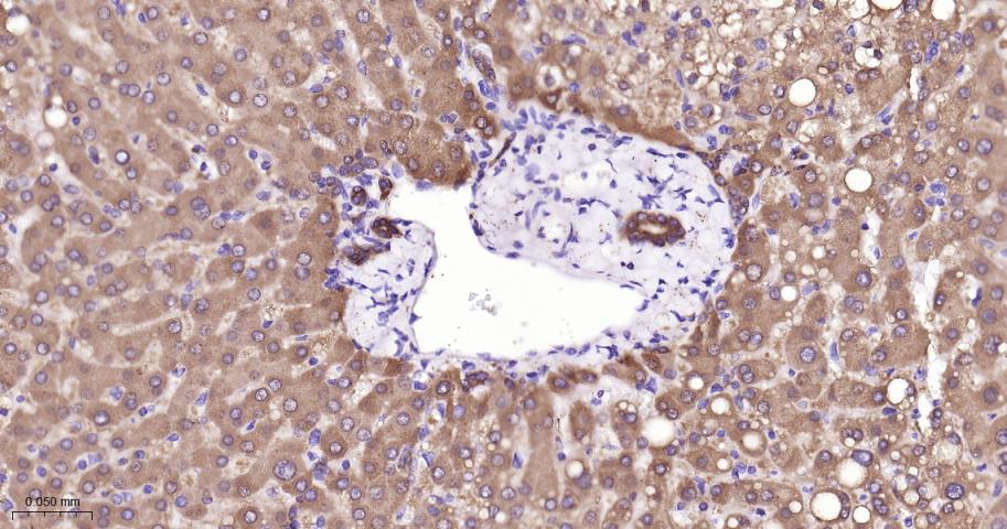 Paraformaldehyde-fixed, paraffin embedded Human Liver; Antigen retrieval by boiling in sodium citrate buffer (pH6.0) for 15 min; The section was incubated with SCF? Monoclonal Antibody, Unconjugated (bsm-61250R) at 1:200 overnight at 4°C, followed by conjugation to the bs-0295G-HRP and DAB (C-0010) staining.