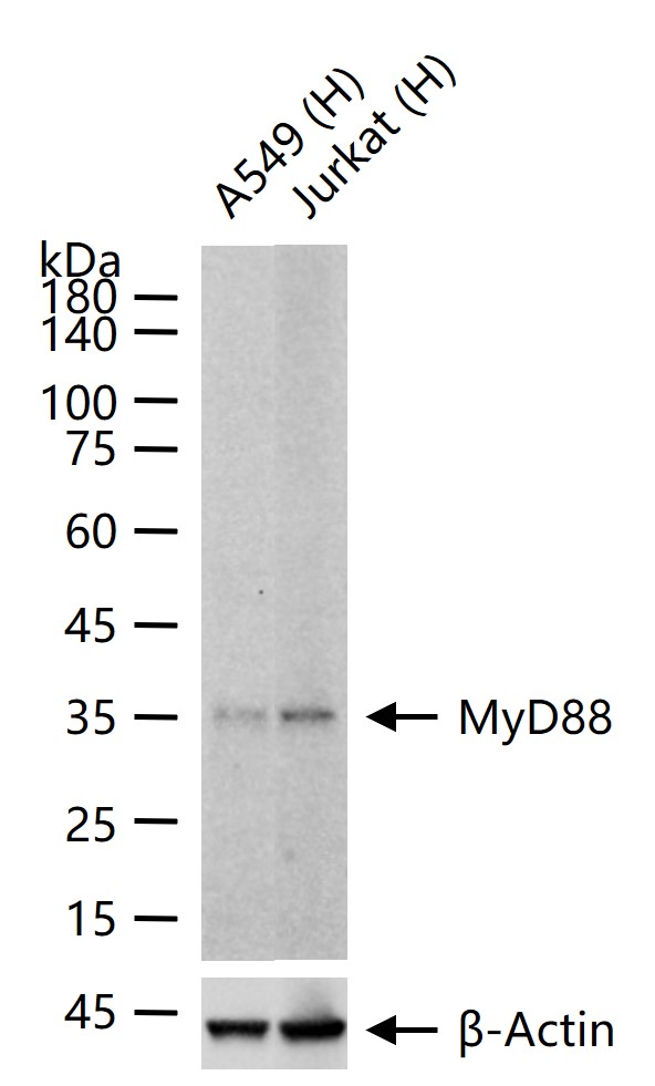 25 ug total protein per lane of various lysates (see on figure) probed with MyD88 monoclonal antibody, unconjugated (bsm-61269R) at 1:2000 dilution and 4°C overnight incubation. Followed by conjugated secondary antibody incubation at r.t. for 60 min.