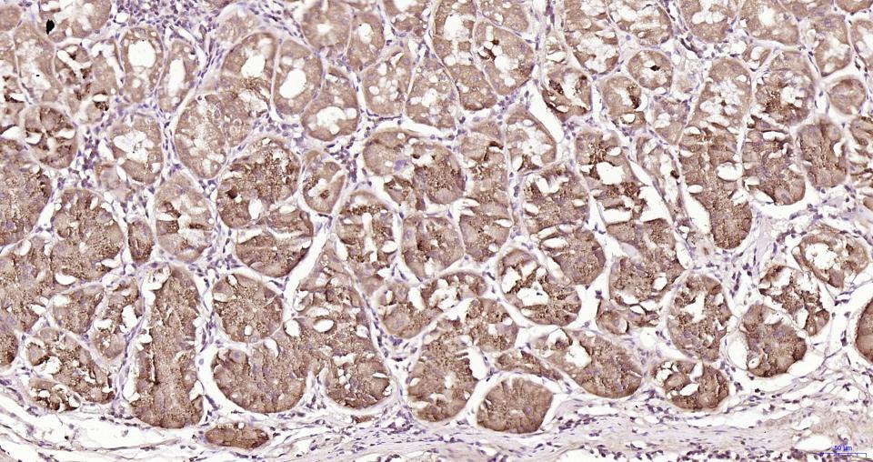 Paraformaldehyde-fixed, paraffin embedded Human Stomach; Antigen retrieval by boiling in sodium citrate buffer (pH6.0) for 15 min; Antibody incubation with MyD88 Monoclonal Antibody, Unconjugated(bsm-61269R) at 1:200 overnight at 4°C, followed by conjugation to the SP Kit(Rabbit, SP-0023) and DAB (C-0010) staining.