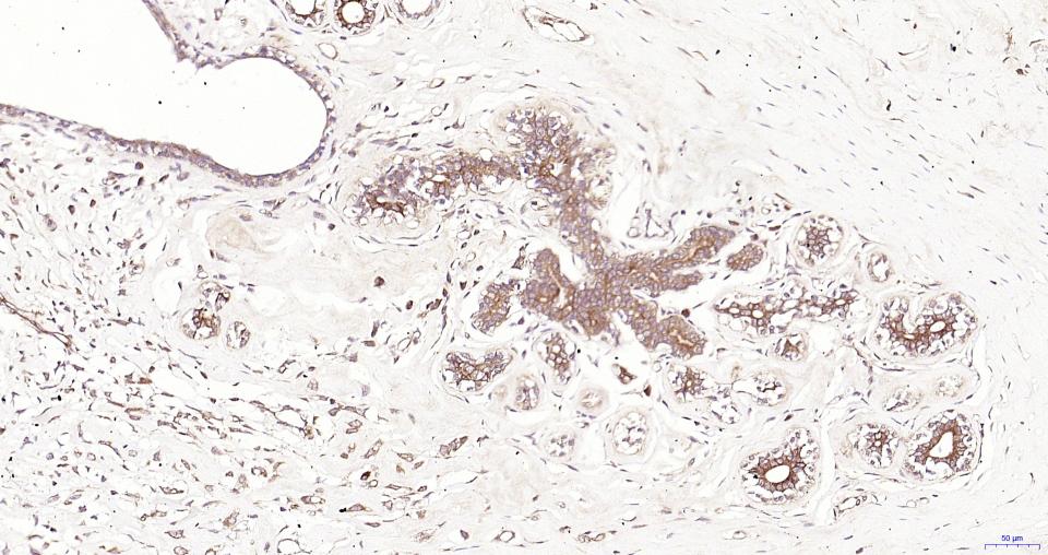 Paraformaldehyde-fixed, paraffin embedded Human Breast Cancer; Antigen retrieval by boiling in sodium citrate buffer (pH6.0) for 15 min; Antibody incubation with MyD88 Monoclonal Antibody, Unconjugated(bsm-61269R) at 1:200 overnight at 4°C, followed by conjugation to the SP Kit(Rabbit, SP-0023) and DAB (C-0010) staining.
