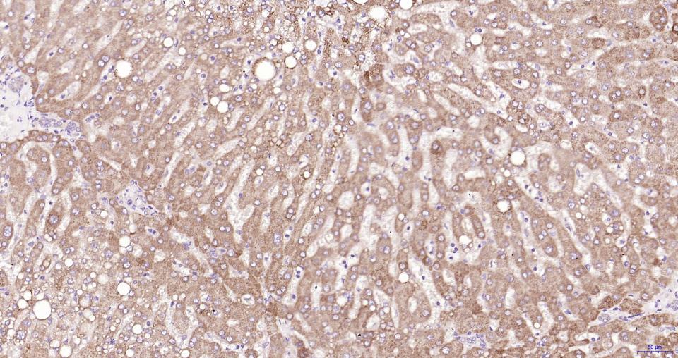 Paraformaldehyde-fixed, paraffin embedded Human Liver; Antigen retrieval by boiling in sodium citrate buffer (pH6.0) for 15 min; Antibody incubation with MyD88 Monoclonal Antibody, Unconjugated(bsm-61269R) at 1:200 overnight at 4°C, followed by conjugation to the SP Kit(Rabbit, SP-0023) and DAB (C-0010) staining.