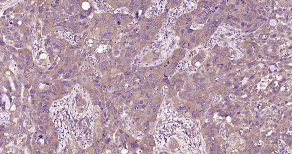 Paraformaldehyde-fixed, paraffin embedded Human Lung Cancer; Antigen retrieval by boiling in sodium citrate buffer (pH6.0) for 15 min; Antibody incubation with MyD88 Monoclonal Antibody, Unconjugated(bsm-61269R) at 1:200 overnight at 4°C, followed by conjugation to the SP Kit(Rabbit, SP-0023) and DAB (C-0010) staining.