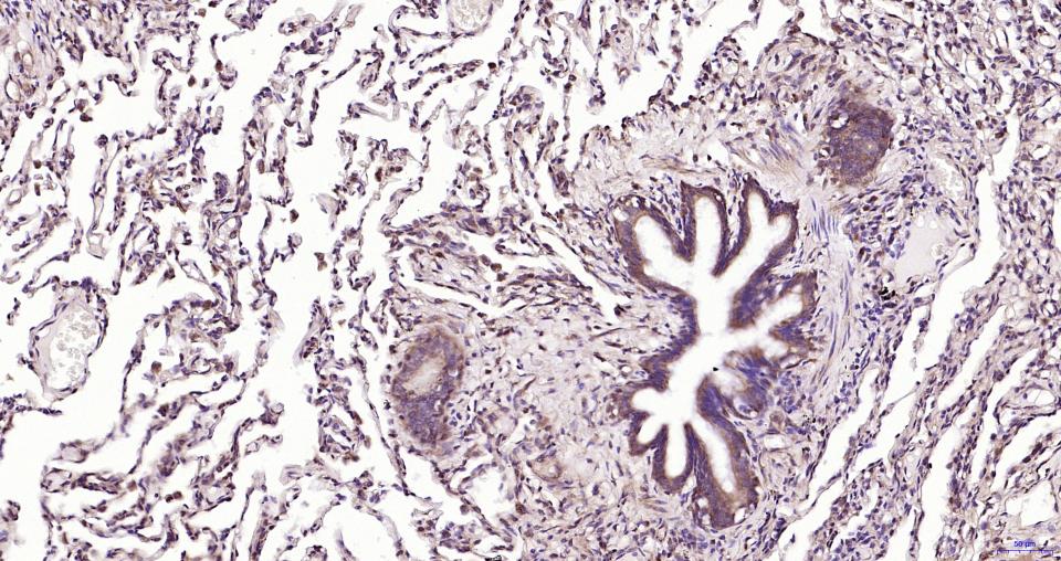 Paraformaldehyde-fixed, paraffin embedded Human Lung ; Antigen retrieval by boiling in sodium citrate buffer (pH6.0) for 15 min; Antibody incubation with MyD88 Monoclonal Antibody, Unconjugated(bsm-61269R) at 1:200 overnight at 4°C, followed by conjugation to the SP Kit(Rabbit, SP-0023) and DAB (C-0010) staining.