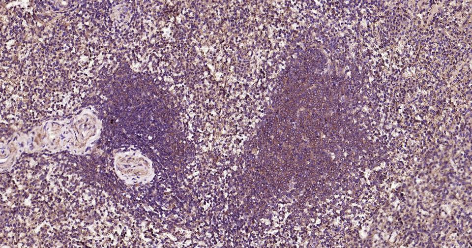 Paraformaldehyde-fixed, paraffin embedded Human Spleen; Antigen retrieval by boiling in sodium citrate buffer (pH6.0) for 15 min; Antibody incubation with MyD88 Monoclonal Antibody, Unconjugated(bsm-61269R) at 1:200 overnight at 4°C, followed by conjugation to the bs-0295G-HRP and DAB (C-0010) staining.