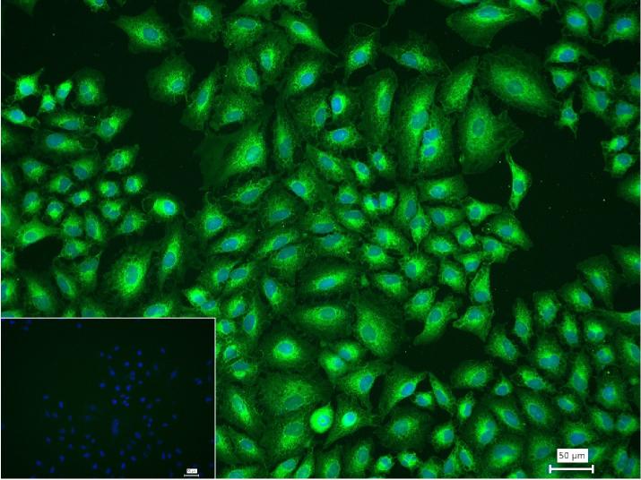 4% Paraformaldehyde-fixed A549 (H) cell; Triton X-100 at r.t. for 20 min; Antibody incubation with (MyD88) monoclonal Antibody, unconjugated (bsm-61269R) 1:100, 90 min at 37°C; followed by conjugated Goat Anti-Rabbit IgG antibody (green, bs-40295G-FITC) at 37°C for 90 min, DAPI (blue, C02-04002) was used to stain the cell nuclei. PBS instead of the primary antibody was used as the blank control.