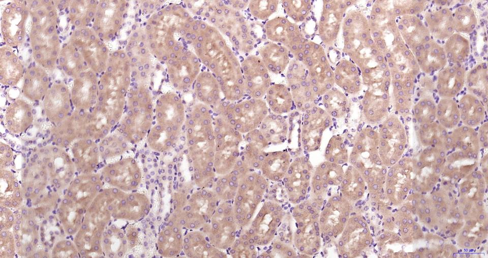 Paraformaldehyde-fixed, paraffin embedded Mouse kidney; Antigen retrieval by boiling in sodium citrate buffer (pH6.0) for 15 min; Antibody incubation with IKK alpha Monoclonal Antibody, Unconjugated (bsm-61295R) at 1:200 overnight at 4°C, followed by conjugation to the bs-0295G-HRP and DAB (C-0010) staining.