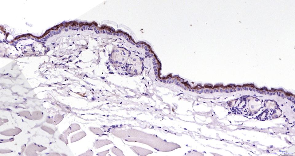 Paraformaldehyde-fixed, paraffin embedded Mouse skin; Antigen retrieval by boiling in sodium citrate buffer (pH6.0) for 15 min; Antibody incubation with IKK alpha Monoclonal Antibody, Unconjugated (bsm-61295R) at 1:200 overnight at 4°C, followed by conjugation to the bs-0295G-HRP and DAB (C-0010) staining.