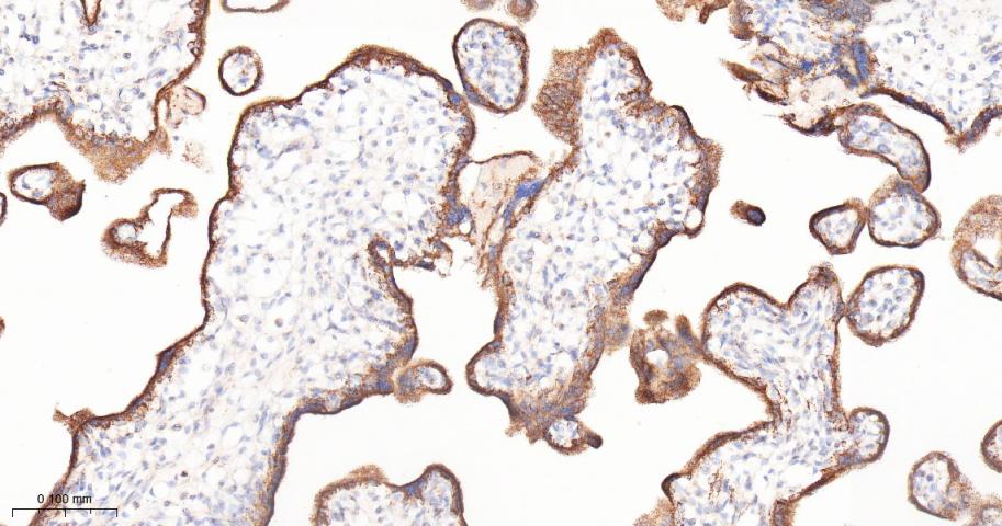 Paraformaldehyde-fixed, paraffin embedded Human Placenta; Antigen retrieval by boiling in sodium citrate buffer (pH6.0) for 15 min; Antibody incubation with TNFAIP3 Monoclonal Antibody, Unconjugated(bsm-61300R) at 1:100 overnight at 4°C, followed by conjugation to the bs-0295G-HRP and DAB (C-0010) staining.