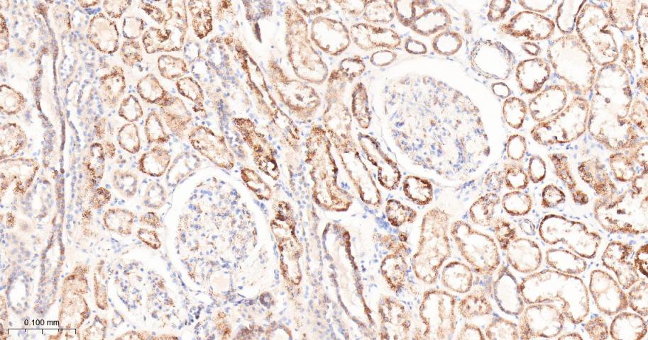Paraformaldehyde-fixed, paraffin embedded Human Kidney; Antigen retrieval by boiling in sodium citrate buffer (pH6.0) for 15 min; Antibody incubation with TNFAIP3 Monoclonal Antibody, Unconjugated(bsm-61300R) at 1:100 overnight at 4°C, followed by conjugation to the bs-0295G-HRP and DAB (C-0010) staining.