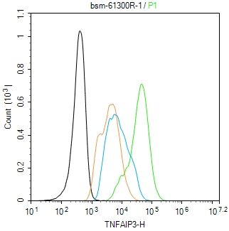 The Hela (H) cells were fixed with 4% PFA (10 min at r.t.) and then permeabilized with 90% ice-cold methanol for 20 min at -20℃,the cells then were incubated in 5%BSA to block non-specific protein-protein interactions (30 min at r.t.).Primary Antibody (green):Rabbit Anti-TNFAIP3 antibody (bsm-61300R): 1 μg/10^6 cells; Secondary Antibody (white blue): Goat anti-Rabbit IgG-FITC (bs-40295G-FITC): 1 μg/test. Isotype Control (orange): Rabbit IgG (bs-0295P). Blank control (black): PBS. Acquisition of 20,000 events was performed.