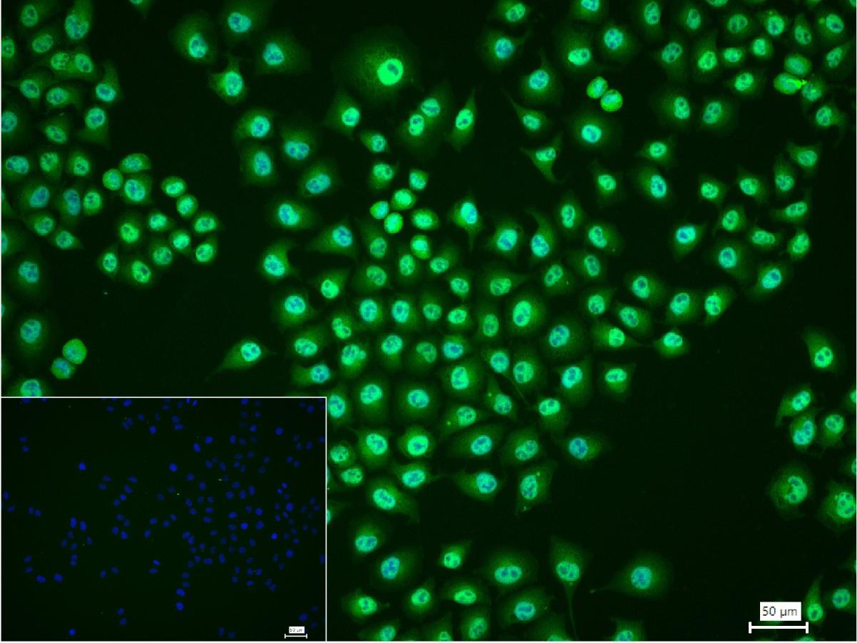 4% Paraformaldehyde-fixed Hela (H) cell; Triton X-100 at r.t. for 20 min; Antibody incubation with (TNFAIP3) monoclonal Antibody, unconjugated (bsm-61300R) 1:100, 90 min at 37°C; followed by conjugated Goat Anti-Rabbit IgG antibody (green, bs-40295G-FITC) at 37°C for 90 min, DAPI (blue, C02-04002) was used to stain the cell nuclei. PBS instead of the primary antibody was used as the blank control.