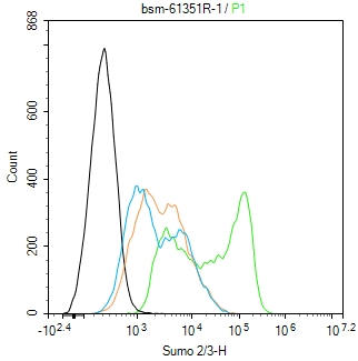 The Hela (H) cells were fixed with 4% PFA (10 min at r.t.) and then permeabilized with 90% ice-cold methanol for 20 min at -20℃,the cells then were incubated in 5%BSA to block non-specific protein-protein interactions (30 min at r.t.).Primary Antibody (green):Rabbit Anti-Sumo 2/3 antibody (bsm-61351R): 1 μg/10^6 cells; Secondary Antibody (white blue): Goat anti-Rabbit IgG-FITC (bs-40295G-FITC): 1 μg/test. Isotype Control (orange): Rabbit IgG (bs-0295P). Blank control (black): PBS. Acquisition of 20,000 events was performed.