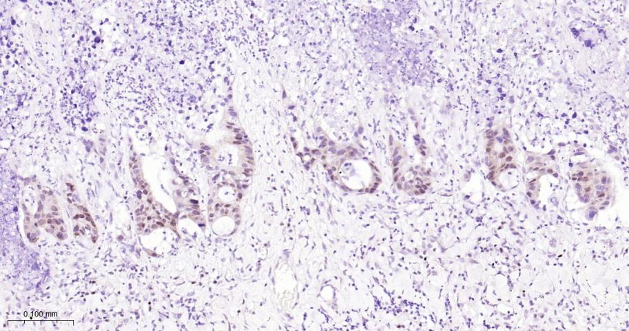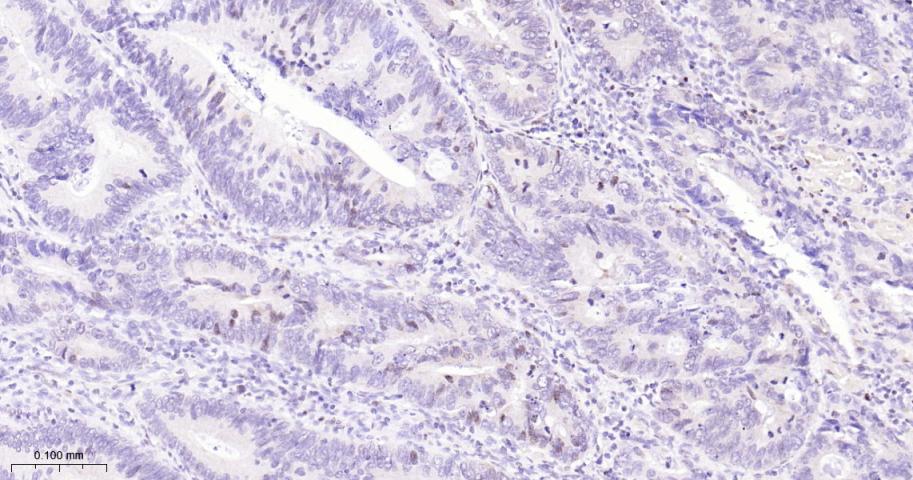 Paraformaldehyde-fixed, paraffin embedded Human Colon Cancer; Antigen retrieval by boiling in sodium citrate buffer (pH6.0) for 15 min; Antibody incubation with MGMT Monoclonal Antibody, Unconjugated(bsm-61358R) at 1:200 overnight at 4°C, followed by conjugation to the bs-0295G-HRP and DAB (C-0010) staining.