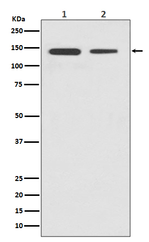 Western blot analysis of (1) HeLa cell lysate; (2) Mouse brain lysate. Using CTCF (bsm-61422R) monoclonal antibody at 1:1000 dilution and 4°C overnight incubation. Followed by conjugated secondary antibody incubation at r.t. for 60 min.