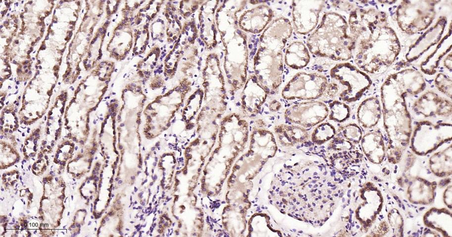 Paraformaldehyde-fixed, paraffin embedded Rat Kidney; Antigen retrieval by boiling in sodium citrate buffer (pH6.0) for 15 min; Antibody incubation with SDHA Monoclonal Antibody, Unconjugated(bsm-61435R) at 1:200 overnight at 4°C, followed by conjugation to the bs-0295G-HRP and DAB (C-0010) staining.