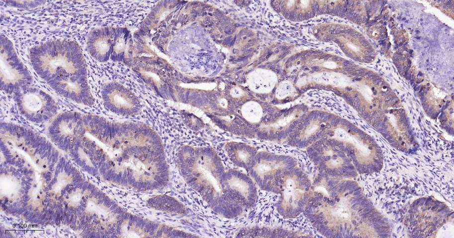 Paraformaldehyde-fixed, paraffin embedded Human Colon Cancer; Antigen retrieval by boiling in sodium citrate buffer (pH6.0) for 15 min; Antibody incubation with SDHA Monoclonal Antibody, Unconjugated(bsm-61435R) at 1:200 overnight at 4°C, followed by conjugation to the bs-0295G-HRP and DAB (C-0010) staining.