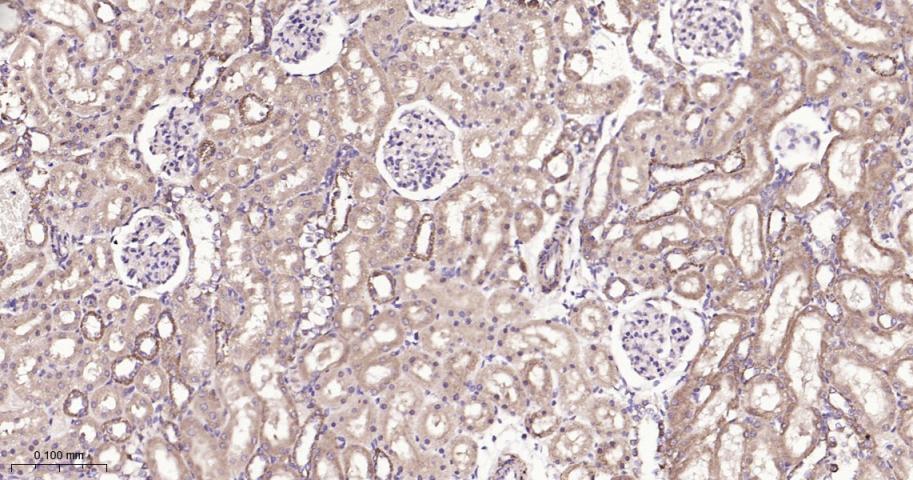 Paraformaldehyde-fixed, paraffin embedded Mouse Kidney; Antigen retrieval by boiling in sodium citrate buffer (pH6.0) for 15 min; Antibody incubation with SDHA Monoclonal Antibody, Unconjugated(bsm-61435R) at 1:200 overnight at 4°C, followed by conjugation to the bs-0295G-HRP and DAB (C-0010) staining.