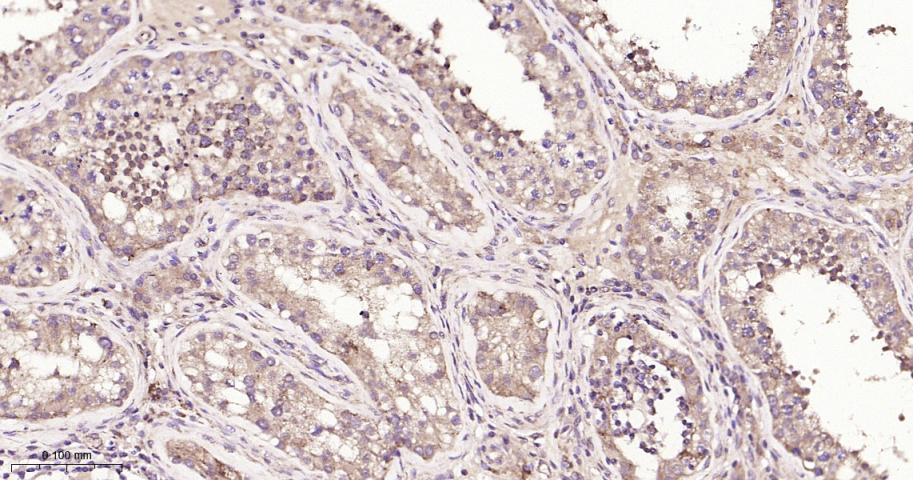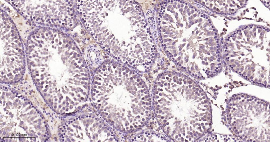 Paraformaldehyde-fixed, paraffin embedded Rat Testicles; Antigen retrieval by boiling in sodium citrate buffer (pH6.0) for 15 min; Antibody incubation with SDHA Monoclonal Antibody, Unconjugated(bsm-61435R) at 1:200 overnight at 4°C, followed by conjugation to the bs-0295G-HRP and DAB (C-0010) staining.