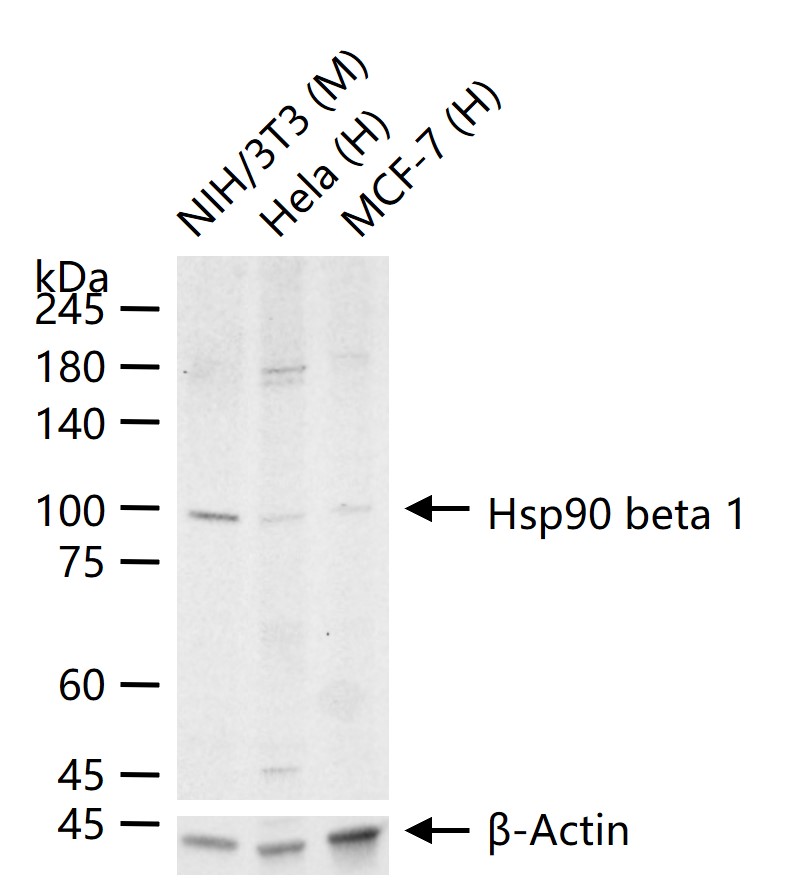 25 ug total protein per lane of various lysates (see on figure) probed with Hsp90 beta 1 monoclonal antibody, unconjugated (bsm-61455R) at 1:1000 dilution and 4°C overnight incubation. Followed by conjugated secondary antibody incubation at r.t. for 60 min.