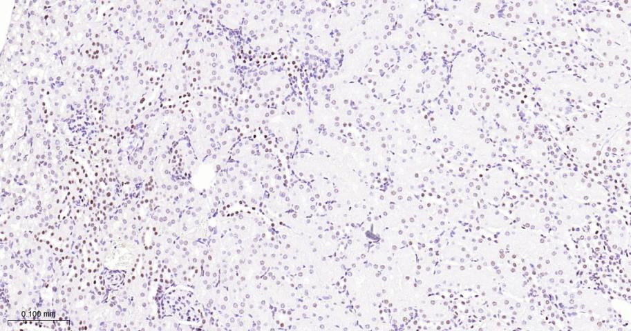 Paraformaldehyde-fixed, paraffin embedded Rat Kidney; Antigen retrieval by boiling in sodium citrate buffer (pH6.0) for 15 min; The section was incubated with p53BP1 Monoclonal Antibody, Unconjugated (bsm-61471R) at 1:200 overnight at 4°C, followed by conjugation to the bs-0295G-HRP and DAB (C-0010) staining.