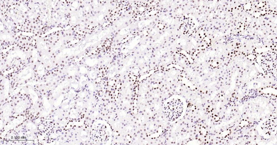 Paraformaldehyde-fixed, paraffin embedded Mouse Kidney; Antigen retrieval by boiling in sodium citrate buffer (pH6.0) for 15 min; The section was incubated with p53BP1 Monoclonal Antibody, Unconjugated (bsm-61471R) at 1:200 overnight at 4°C, followed by conjugation to the bs-0295G-HRP and DAB (C-0010) staining.