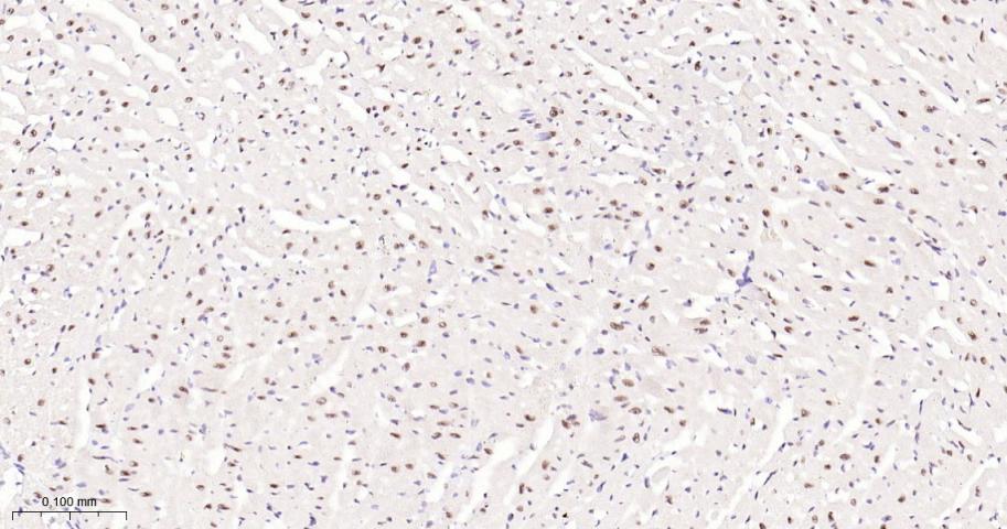Paraformaldehyde-fixed, paraffin embedded Rat Heart; Antigen retrieval by boiling in sodium citrate buffer (pH6.0) for 15 min; The section was incubated with p53BP1 Monoclonal Antibody, Unconjugated (bsm-61471R) at 1:200 overnight at 4°C, followed by conjugation to the bs-0295G-HRP and DAB (C-0010) staining.