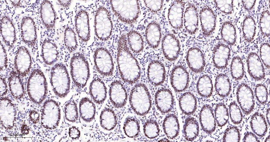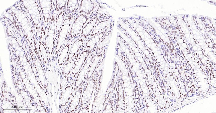 Paraformaldehyde-fixed, paraffin embedded Mouse Colon; Antigen retrieval by boiling in sodium citrate buffer (pH6.0) for 15 min; The section was incubated with p53BP1 Monoclonal Antibody, Unconjugated (bsm-61471R) at 1:200 overnight at 4°C, followed by conjugation to the bs-0295G-HRP and DAB (C-0010) staining.