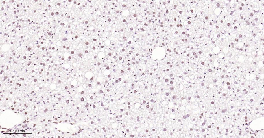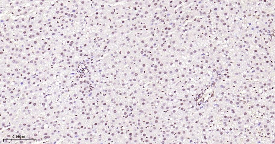 Paraformaldehyde-fixed, paraffin embedded Rat Liver; Antigen retrieval by boiling in sodium citrate buffer (pH6.0) for 15 min; The section was incubated with p53BP1 Monoclonal Antibody, Unconjugated (bsm-61471R) at 1:200 overnight at 4°C, followed by conjugation to the bs-0295G-HRP and DAB (C-0010) staining.