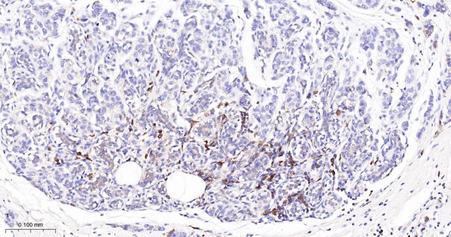 Paraformaldehyde-fixed, paraffin embedded Human Breast Cancer; Antigen retrieval by boiling in sodium citrate buffer (pH6.0) for 15 min; The section was incubated with SFRP1 Monoclonal Antibody, Unconjugated (bsm-61472R) at 1:200 overnight at 4°C, followed by conjugation to the bs-0295G-HRP and DAB (C-0010) staining.