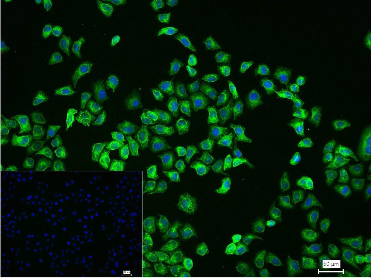 4% Paraformaldehyde-fixed Hela (H) cell; Triton X-100 at r.t. for 20 min; Antibody incubation with (CYP1A2) monoclonal Antibody, unconjugated (bsm-61730R) 1:100, 90 min at 37°C; followed by conjugated Goat Anti-Rabbit IgG antibody (green, bs-40295G-FITC) at 37°C for 90 min, DAPI (blue, C02-04002) was used to stain the cell nuclei. PBS instead of the primary antibody was used as the blank control.