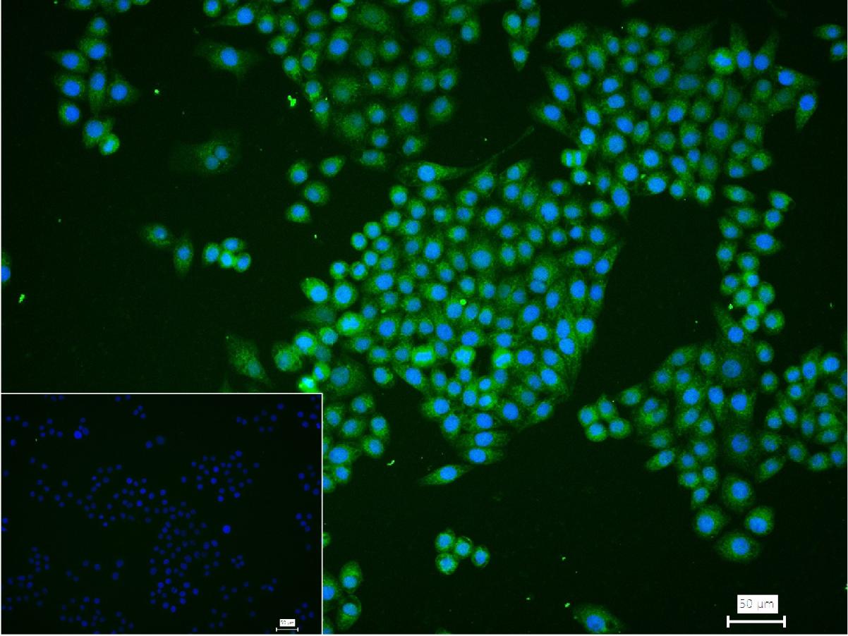 4% Paraformaldehyde-fixed MCF-7 (H) cell; Triton X-100 at r.t. for 20 min; Antibody incubation with (RARB) monoclonal Antibody, unconjugated (bsm-61749R) 1:100, 90 min at 37°C; followed by conjugated Goat Anti-Rabbit IgG antibody (green, bs-40295G-FITC) at 37°C for 90 min, DAPI (blue, C02-04002) was used to stain the cell nuclei. PBS instead of the primary antibody was used as the blank control.