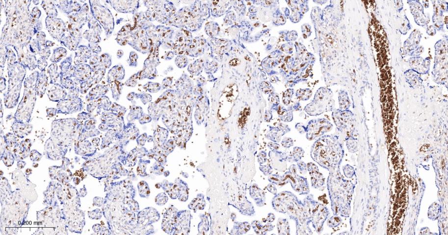 Paraformaldehyde-fixed, paraffin embedded Human Placenta; Antigen retrieval by boiling in sodium citrate buffer (pH6.0) for 15 min; The section was incubated with Glycophorin C/CD236 Monoclonal Antibody, Unconjugated (bsm-61751R) at 1:200 overnight at 4°C, followed by conjugation to the bs-0295G-HRP and DAB (C-0010) staining.