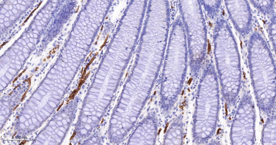 Paraformaldehyde-fixed, paraffin embedded Human Colon; Antigen retrieval by boiling in sodium citrate buffer (pH6.0) for 15 min; The section was incubated with Glycophorin C/CD236 Monoclonal Antibody, Unconjugated (bsm-61751R) at 1:200 overnight at 4°C, followed by conjugation to the bs-0295G-HRP and DAB (C-0010) staining.