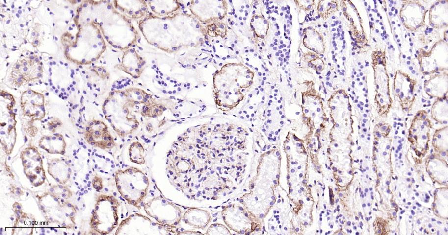 Paraformaldehyde-fixed, paraffin embedded Human Kidney; Antigen retrieval by boiling in sodium citrate buffer (pH6.0) for 15 min; The section was incubated with CDH6 Monoclonal Antibody, Unconjugated (bsm-61762R) at 1:200 overnight at 4°C, followed by conjugation to the bs-0295G-HRP and DAB (C-0010) staining.