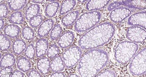 Paraformaldehyde-fixed, paraffin embedded Human Colon; Antigen retrieval by boiling in sodium citrate buffer (pH6.0) for 15 min; Antibody incubation with CRMP2 Monoclonal Antibody, Unconjugated(bsm-61800R) at 1:200 overnight at 4°C, followed by conjugation to the bs-0295G-HRP and DAB (C-0010) staining.