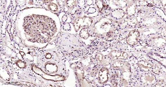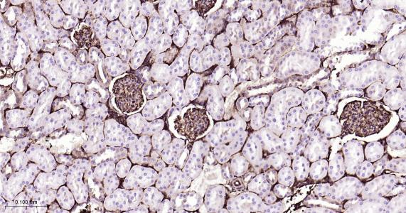 Paraformaldehyde-fixed, paraffin embedded Rat Kidney; Antigen retrieval by boiling in sodium citrate buffer (pH6.0) for 15 min; Antibody incubation with CRMP2 Monoclonal Antibody, Unconjugated(bsm-61800R) at 1:200 overnight at 4°C, followed by conjugation to the bs-0295G-HRP and DAB (C-0010) staining.