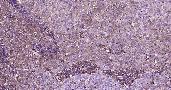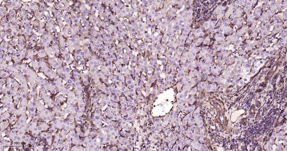 Paraformaldehyde-fixed, paraffin embedded Human Liver; Antigen retrieval by boiling in sodium citrate buffer (pH6.0) for 15 min; Antibody incubation with CRMP2 Monoclonal Antibody, Unconjugated(bsm-61800R) at 1:200 overnight at 4°C, followed by conjugation to the bs-0295G-HRP and DAB (C-0010) staining.